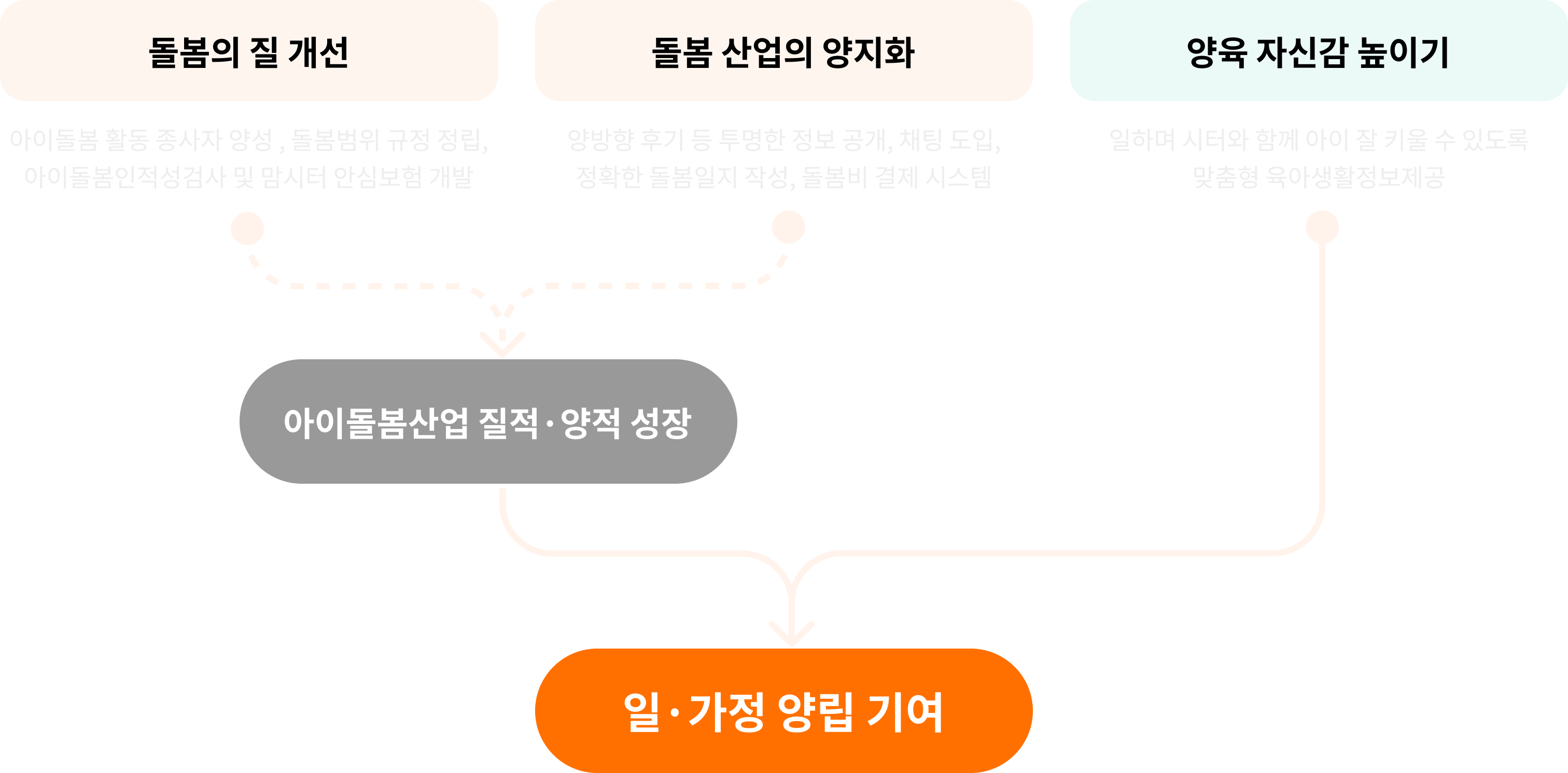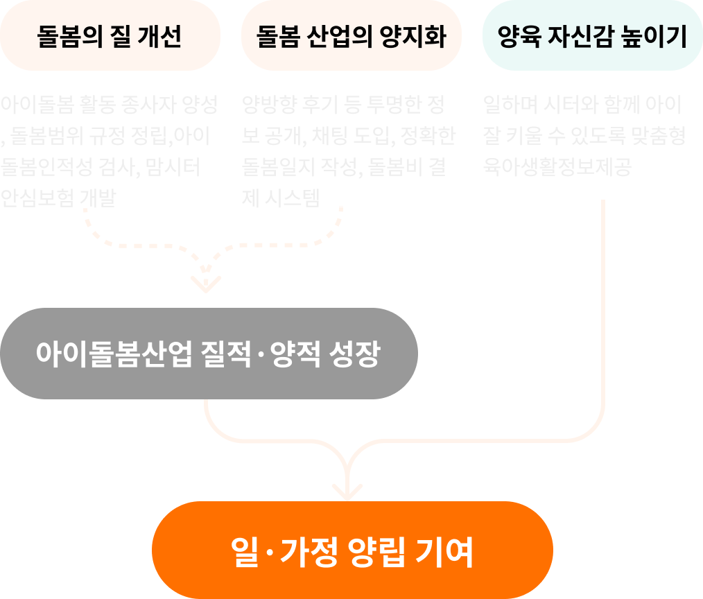 일하며 아이 키우는 부모가 좋은 시터를 만나 아이를 맘편히 잘 키울 수 있도록, 투명한 정보 제공과 돌봄관리 기능으로 신뢰 및 편의성을 높입니다.